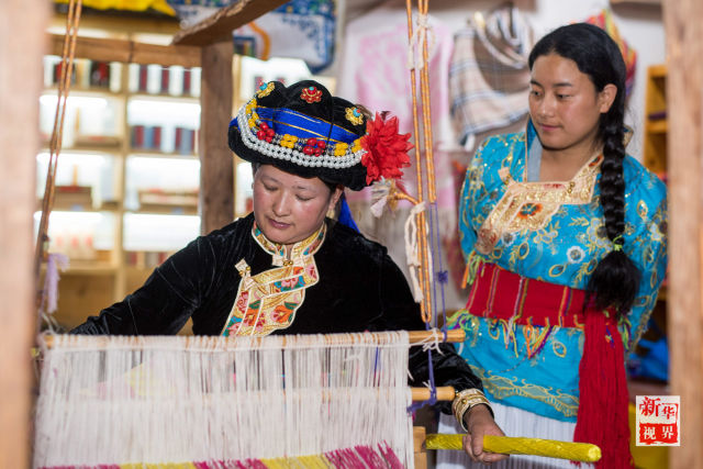 ↑摩梭姑娘边巴拉姆(右)在宁蒗永宁乡落水村的摩梭民俗博物馆里向传承人旦史拉措学习摩梭人传统的织布方式。新华社记者胡超摄
