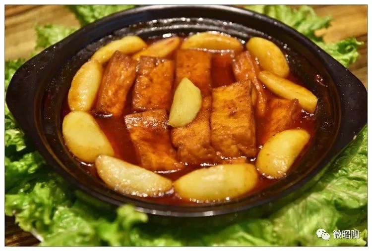 △苹果豆腐煲:苹果入油锅炸至金黄,加入葱头、花椒、鲜露、昭通酱、高汤做底,加入炸好的豆腐条及酱油等调味,装盘时放入炸好的苹果条,吃的时候既有入味的豆腐,也有清甜的苹果。