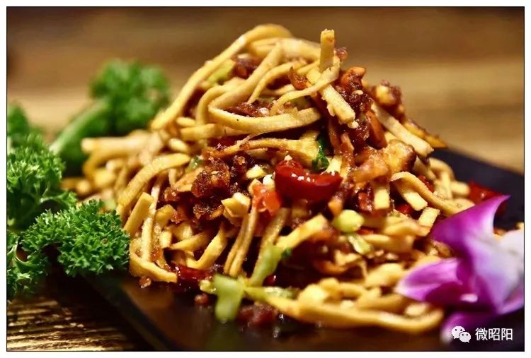 △苹果鲊炒豆腐丝:豆腐丝入油锅炸好备用,之后用猪油加上干辣椒和青辣椒及苹果鲊炒香,加豆腐丝翻炒,再加入糟辣椒、葱花、蒜蓉调味,好吃还下饭。