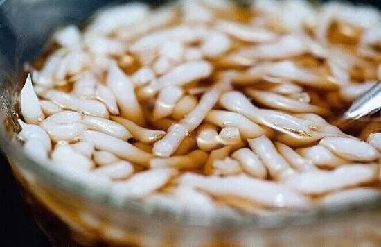 米凉虾是云南的风味小吃,入口滑糯清爽,柔软香甜。米凉虾的做法比较奇特,用大米制浆煮熟,再用漏勺漏入凉水盆中。因头大尾细形似虾,故此得名。