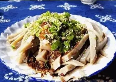 在昭通,从地名上看,大龙洞的凉粉和炎山的热凉粉比较出名;从原料上看,有苞谷凉粉,荞凉粉,豌豆凉粉,豌豆凉粉阵容强大,占领了大部分“凉粉市场”;从姓氏上讲,傅家凉粉、赵家凉粉名声较响。傅家凉粉的原料是市场价格较高、淀粉含量高、口感、筋骨较好的金豌豆。把金豌豆用水浸透,淘洗干净后磨成浆熬煮,熬熟后倒入盆中让其冷却凝固,之后将做好的凉粉放在案板上,用特制的形状若漏勺的铁器在凉粉上轻轻一刮,成条状的凉粉顺着铁器上的小窟窿游鱼一般钻出来,抓了装在碗中,放上香油、葱花、芫荽、蒜水、油辣子、自制的酸汤,一碗色香味俱全的凉粉就摆在你的面前:灰绿色的凉粉,白的酸莲花白,绿的葱花、芫荽,红亮亮的油辣子,还有棕褐色的香菇粒,看着就让人心动,用筷子把佐料拌匀,香气扑鼻,就忍不住馋涎欲滴了。傅家的凉粉除了佐料特别,豆香浓郁外,还有一个特点是筋骨特好,耐储存,放在阴凉的地方,放上十天半月也不会变味。所以,傅家凉粉已经远游到了昆明、广州等地。