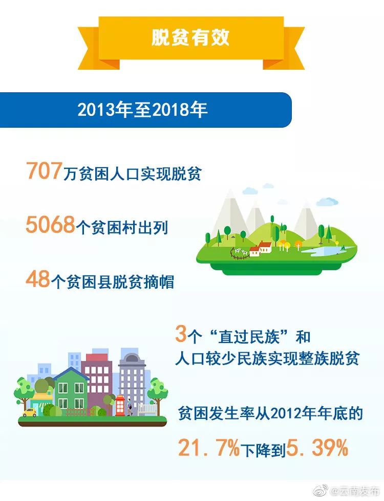 2013年至2018年,全省有707万贫困人口实现脱贫、5068个贫困村出列、48个贫困县脱贫摘帽,贫困发生率从2012年年底的21.7%下降到5.39%,2020年将全面完成脱贫任务。