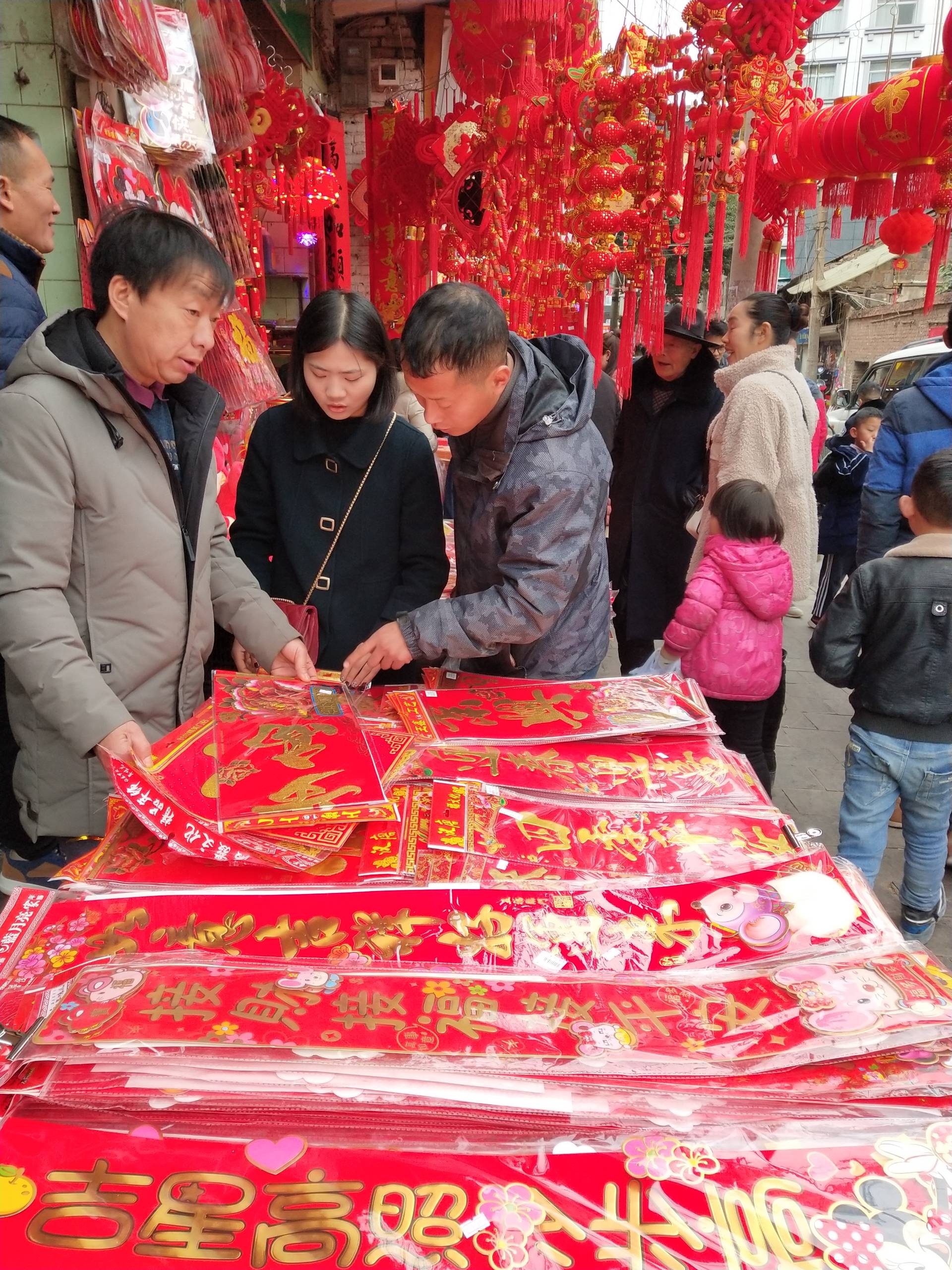 1月17日,春节临近,走进彝良东西正街和财富中心年货街等,只见中国结、红灯笼、春联、窗花、大红福字及琳琅满目的食品,让人目不暇接,忙碌了一年的人们正精心挑选年画、购买年货等,准备过一个热热闹闹的春节,年味已越来越浓。