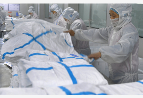 1月28日,在浙江省湖州市莫干山高新区的一家医疗科技股份有限公司生产车间,工人加班赶制防护服,助力抗击新型冠状病毒感染的肺炎疫情。
