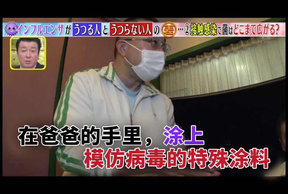 节目组在小阪先生的手上喷了特殊荧光染料,用来模拟被流感病毒感染的场景。