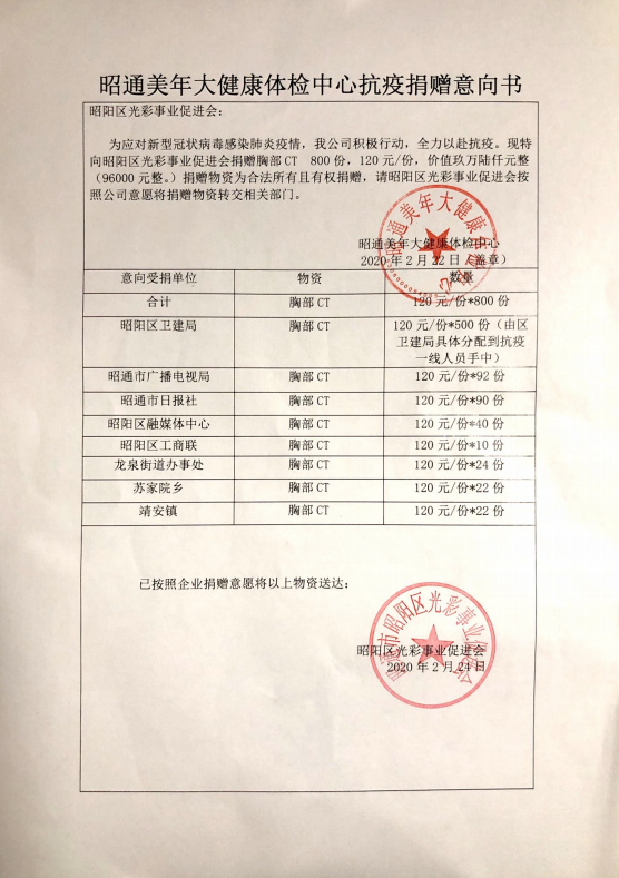 2月24日,昭通美年大健康体检中心先后来到昭通日报社、昭通广播电视台,向昭通抗击疫情在一线的新闻媒体工作者捐赠300份胸部CT检查,其中,昭通日报社获赠90份。