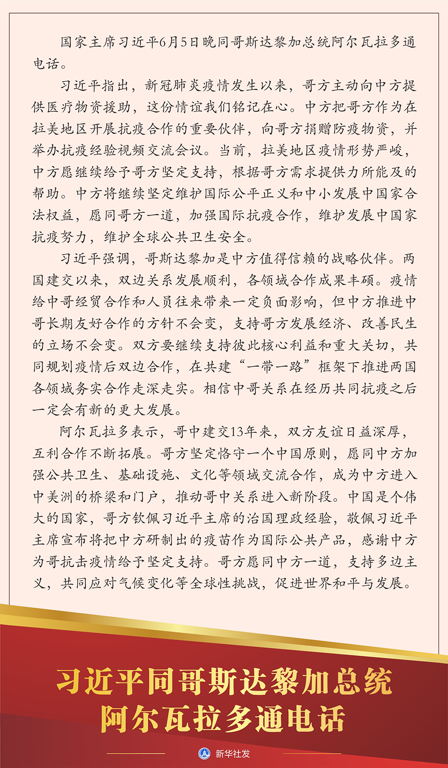 习近平指出,新冠肺炎疫情发生以来,哥方主动向中方提供医疗物资援助,这份情谊我们铭记在心。中方把哥方作为在拉美地区开展抗疫合作的重要伙伴,向哥方捐赠防疫物资,并举办抗疫经验视频交流会议。当前,拉美地区疫情形势严峻,中方愿继续给予哥方坚定支持,根据哥方需求提供力所能及的帮助。中方将继续坚定维护国际公平正义和中小发展中国家合法权益,愿同哥方一道,加强国际抗疫合作,维护发展中国家抗疫努力,维护全球公共卫生安全。