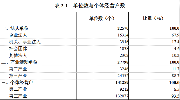 2018年末,在第二产业和第三产业法人单位中,位居前三位的行业是:批发和零售业5819个,占25.8%;公共管理、社会保障和社会组织4826个,占21.4%;租赁和商务服务业2348个,占10.4%。在个体经营户中,位居前三位的行业是:批发和零售业71767个,占50.8%;交通运输、仓储和邮政业29754个,占21.1%;住宿和餐饮业17531个,占12.4%(详见表2-2)。