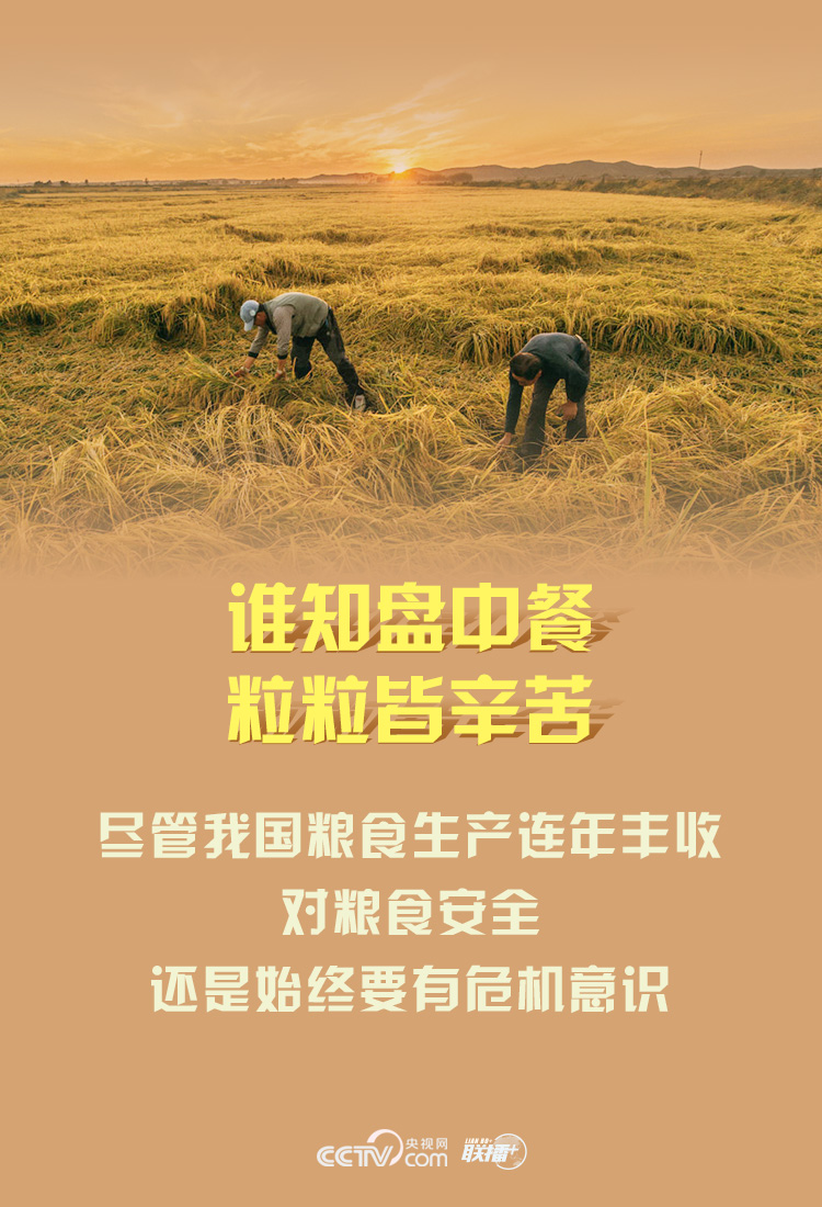 当前,受新冠肺炎疫情影响,全球范围内的饥饿人数有所增加,尽管我国的粮食生产连年丰收,但对粮食安全仍要有危机意识。适逢中秋、国庆双节宴请高峰期,牢记“勤俭是我们的传家宝”,珍惜盘中餐,和总书记一起对浪费说“不”!