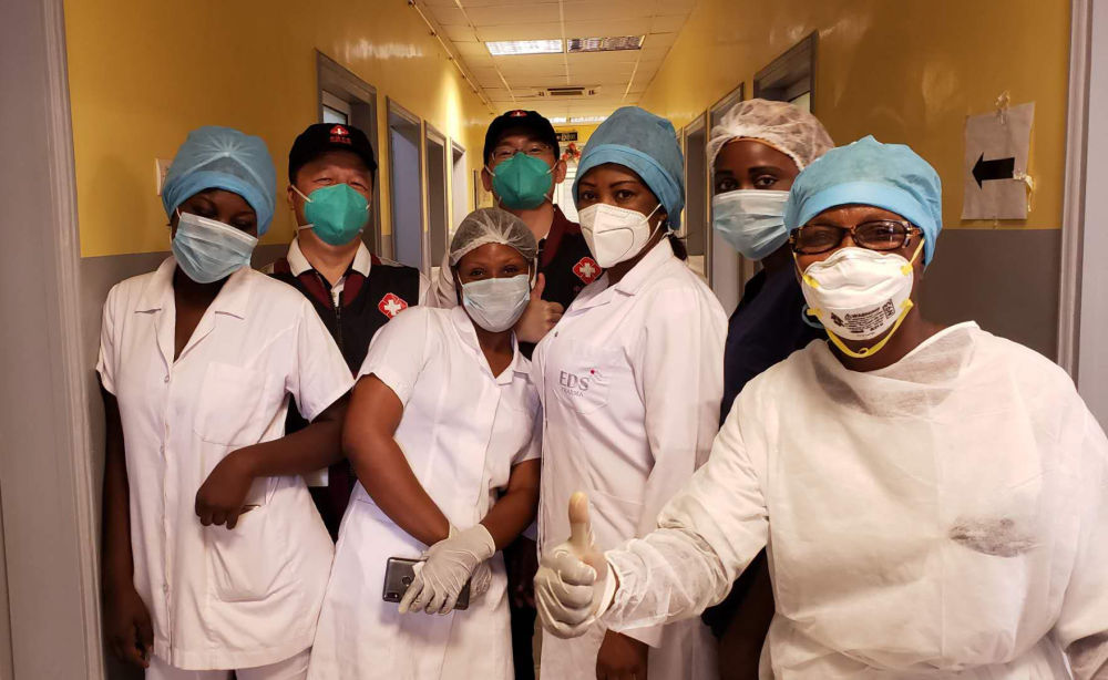 5月26日,中国抗疫医疗专家组在刚果(布)首都布拉柴维尔指导新冠肺炎病房建设时,与当地一线医务人员合影。新华社发