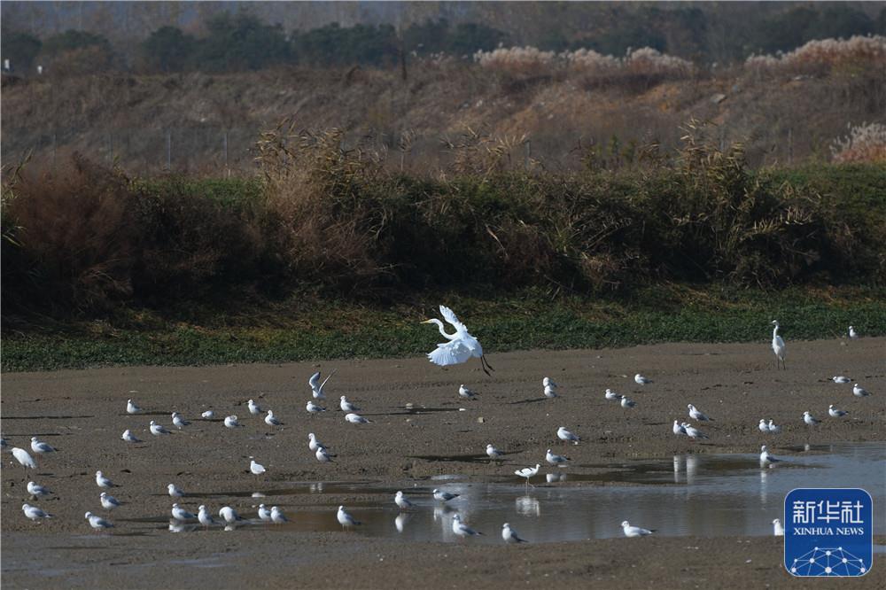 这是2019年11月22日拍摄的安徽巢湖边一处鸟类翔集的湿地。新华社记者 张端 摄