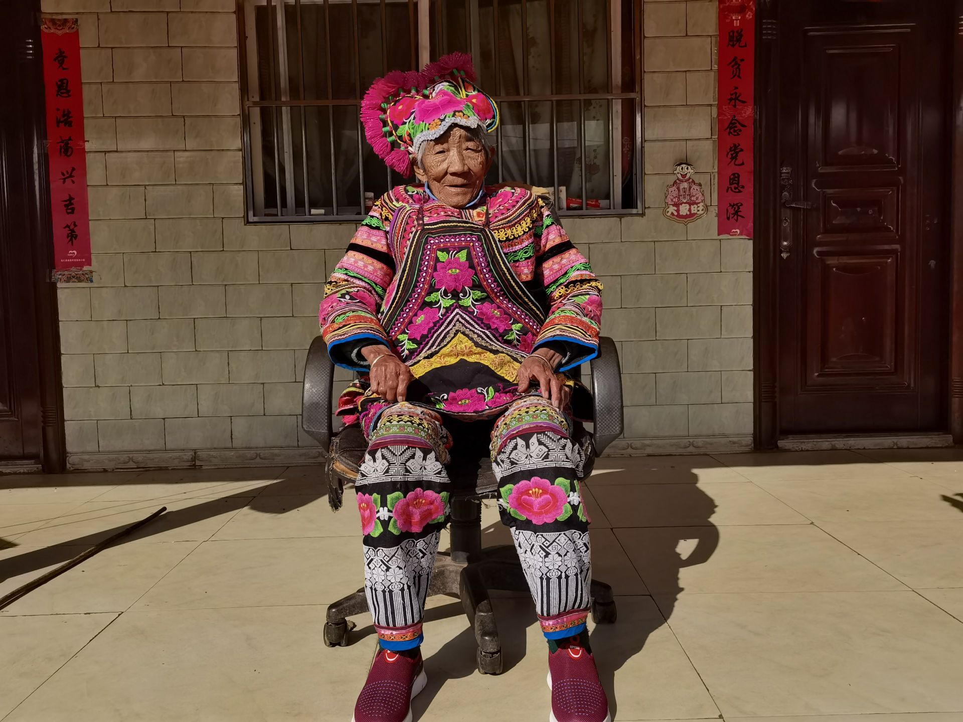 走进直苴村一户人家的土掌房,一位身着节日盛装的老人坐在阳光下。老人的服装黑色为底,上面绣满红色的花、绿色的叶,还有和阳光一样金黄色的花纹图案。