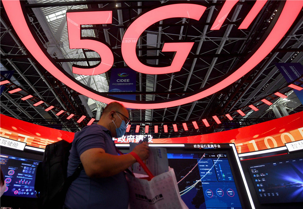 在河北省石家庄市举行的2021中国国际数字经济博览会上,参观者走过5G智慧展区(2021年9月6日摄)。新华社记者 王晓 摄