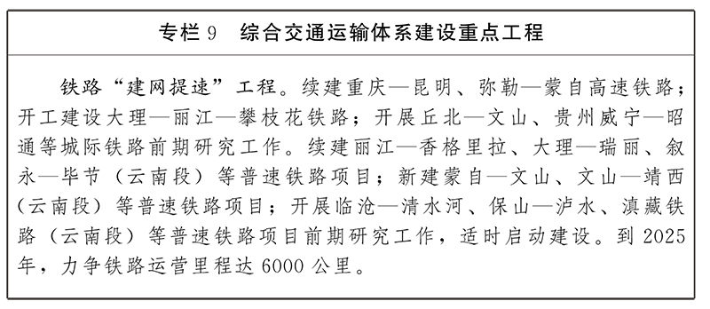 提升区域间互联互通水平。以“加密滇中、沿边拉通、滇西循环、互联互通”为重点,全面实施县域高速公路“互联互通”、“能通全通”工程,加快建设“轨道上的滇中城市群”,推进干线铁路、城际铁路、市域(郊)铁路、城市轨道交通“四网融合”,实现各区域相邻城市直达联通,高速公路与重要车站、机场、港口码头无缝接驳,促进不同运输方式和城市内外交通之间便捷换乘、无缝衔接。实施铁路“建网提速”工程,推动沿边铁路建设,加快推动普速铁路站点覆盖所有州、市,力争高铁站点覆盖更多城市。实施航空“强基拓线”工程,完善区域内环飞串飞航线网络,形成快速、便捷的区域交通网络。深入实施多式联运示范工程,推进昆明、昭通、曲靖、玉溪、红河、大理、丽江等地区率先实现多种运输方式有机衔接。