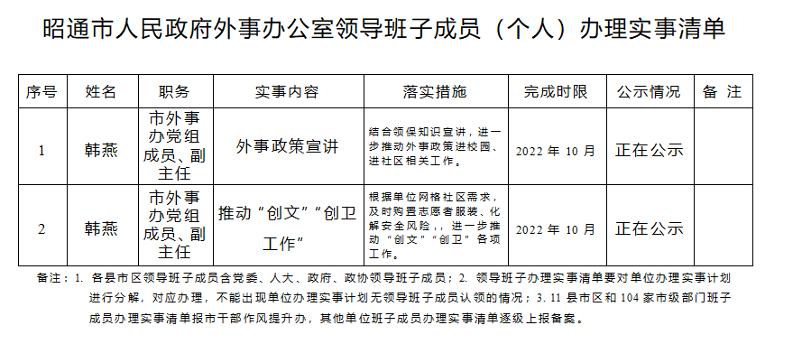 为认真贯彻落实省委、省政府开展作风革命效能革命部署要求和《中共昭通市委 昭通市人民政府关于在全市深入开展 干部作风大提升专项行动的实施意见》,切实把办理实事贯穿专项行动始终,力所能及为群众办实事、为企业解难题,确保干部作风大提升专项行动取得更大成效,昭通市人民政府外事办公室对我办办理实事计划及领导班子成员(个人)办理实事清单进行了梳理汇总,“清单”立足群众所期所盼,以解决群众反映强烈的痛点堵点难点问题为出发点和落脚点,切实把实事办实,把实事办好,办到群众心坎上。现将“清单”进行公示,欢迎全市广大党员群众监督。