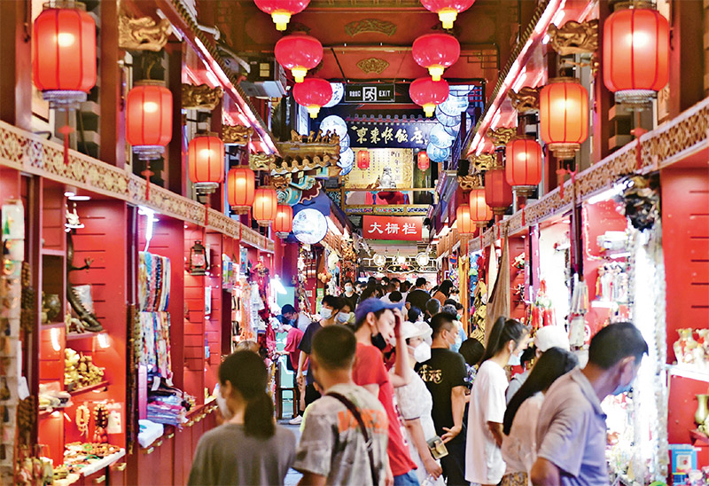 为进一步激发消费需求、鼓励夜间经济发展,2022年7月15日晚,“2022北京消费季·夜京城”活动启动。图为7月16日,游客在前门大栅栏商业街游览。 新华社记者 张晨霖/摄
