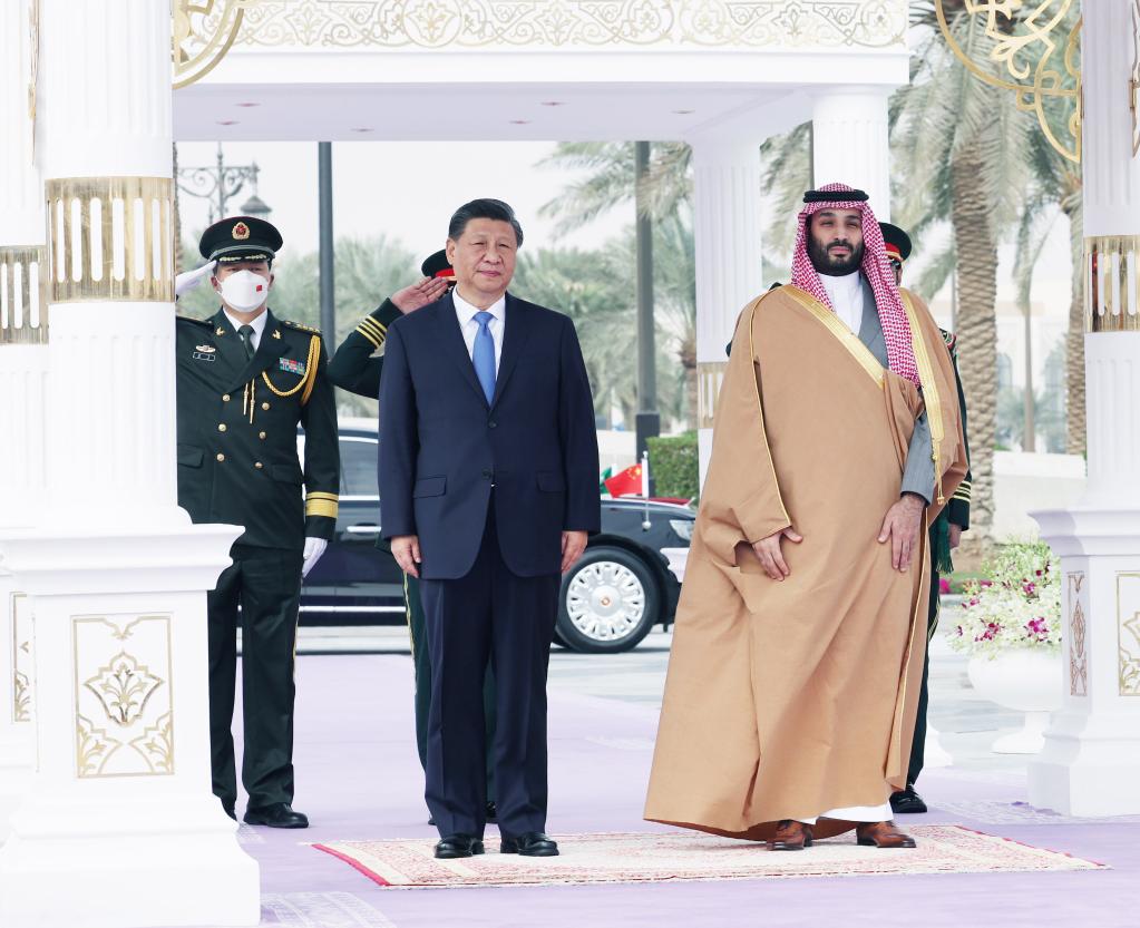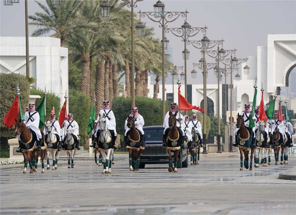 欢迎仪式后,习近平在利雅得王宫同穆罕默德王储举行会谈。习近平指出,当前国际和地区形势深刻复杂演变,中沙关系的战略性和全局性更加凸显。中方把发展对沙特关系置于外交全局尤其是中东外交的优先方向,愿同沙方推动中沙全面战略伙伴关系得到更大发展。