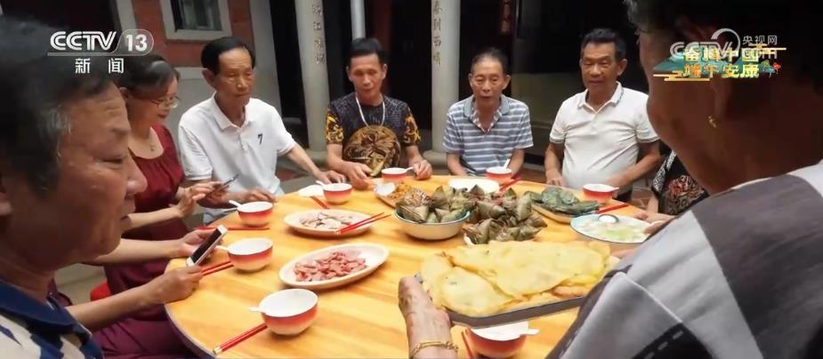 在福建晋江,大家围炉而坐,正在品尝端午小吃“煎堆”,古时称为“煎䬾”,是饼状面食。在福建晋江民间,流传着“煎堆”补天的说法。古时,当地居民耕海牧田,端午前后常常阴雨连绵,盼晴心切的人们想出端午节吃“煎堆”的妙招,祈愿天快放晴。清代乾隆版《泉州府志》卷二十记载:“以米粉或面和物于油内煎之。” 将糯米粉、麦粉和白糖、清水混合,大火煎烤,是一份独特的端午记忆,也传承了古时端午的味道。