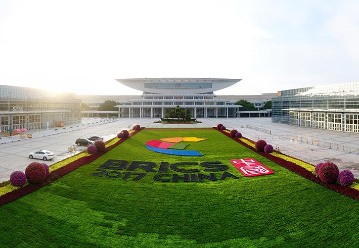 △厦门国际会展中心广场上的金砖国家领导人厦门会晤主题花坛