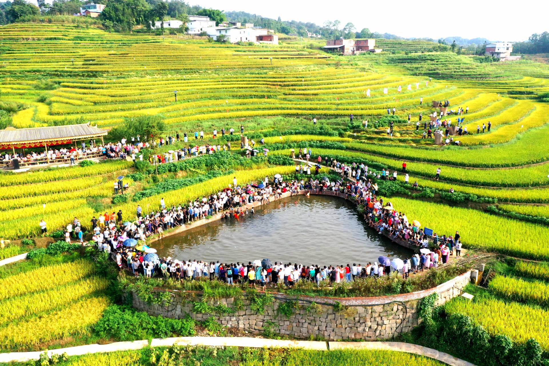 舞台上演员尽情表演,稻田边网红激情直播,割穗打谷、池塘抓鸭、稻田拔河……8月22日,水富市向家坝镇2023年农民丰收节大型主题活动在永安村精彩上演,田埂上、稻田旁、池塘边、花丛中、树荫下、凉亭里,如潮流动的游客连成了数公里的长龙,共同分享着丰收的喜悦。