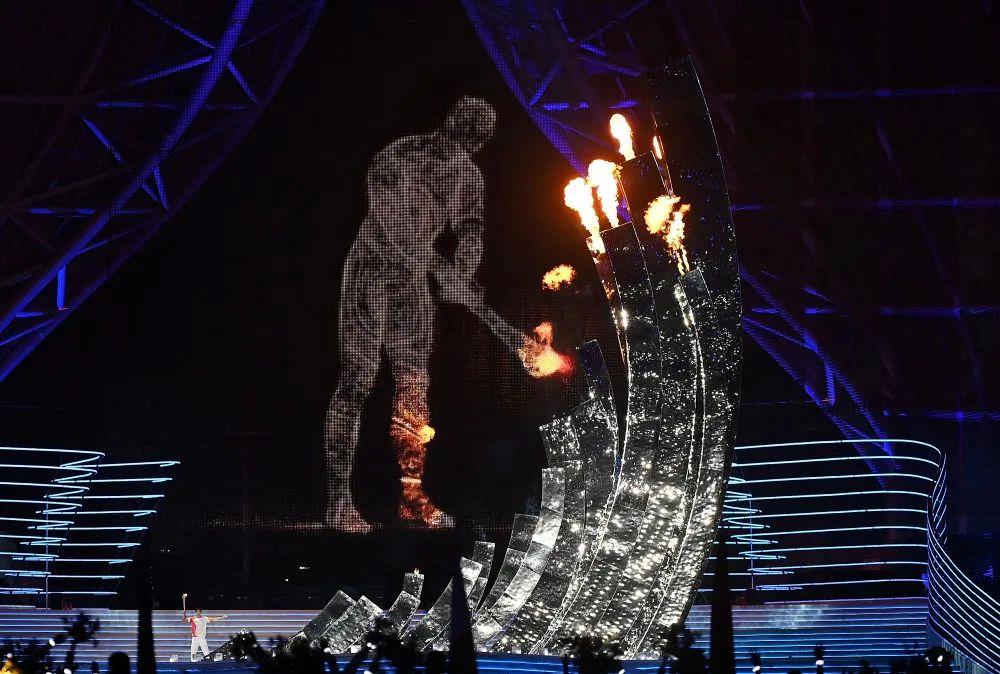 △“数字火炬手”点燃象征亚洲大团结的亚运之火。