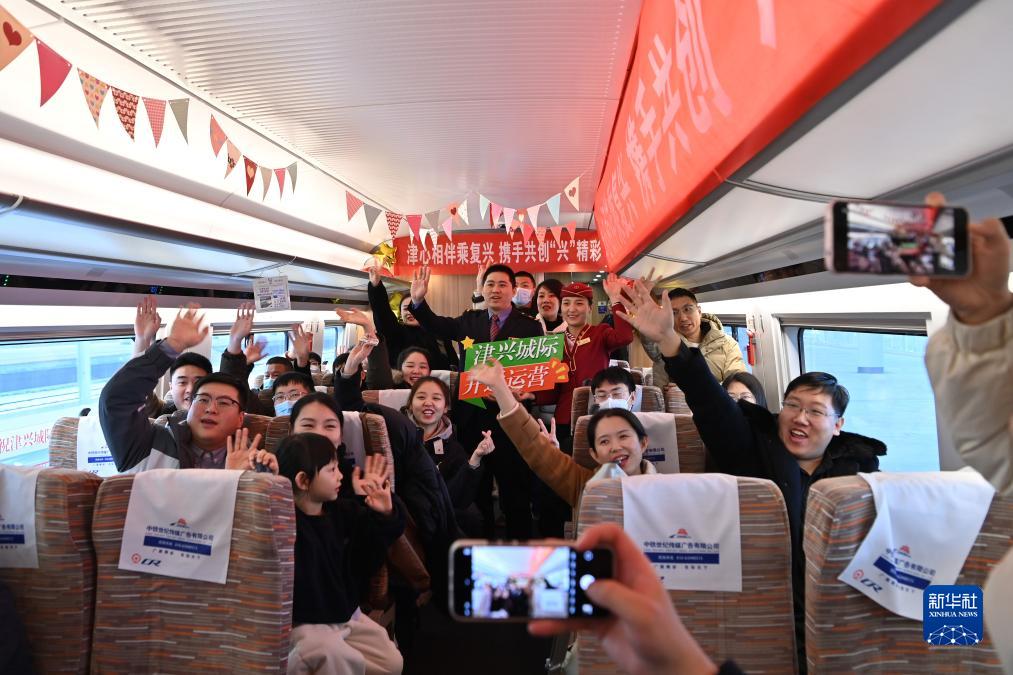 2023年12月18日,津兴城际列车工作人员和旅客在车厢内合影留念。新华社记者 李然 摄