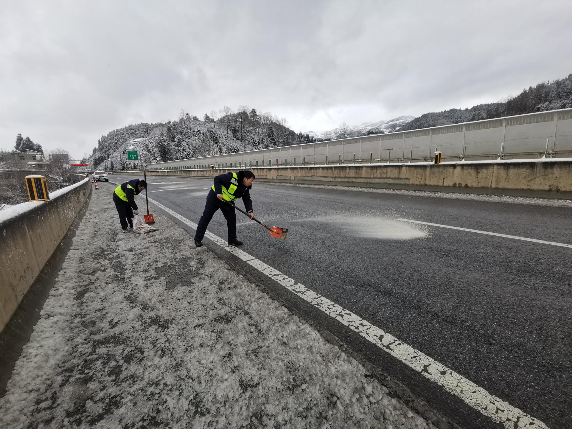 2024年1月21日7时20分,受低温雨雪凝冻天气持续影响,云南交投集团昭通管理处昭阳分处上高桥隧管辖区银昆高速G85线麻昭段K1699 015至K1738 300(大关至昭通方向,双向)出现不同程度降雪,影响车辆正常通行。上高桥隧管站闻令而动,持续开展融雪除冰保畅工作,共出动工作人员45人、撒布机2台、撒布车2辆、装载机2台,投入融雪剂62吨。截至1月22日上午8时30分,全路段已恢复正常通行。