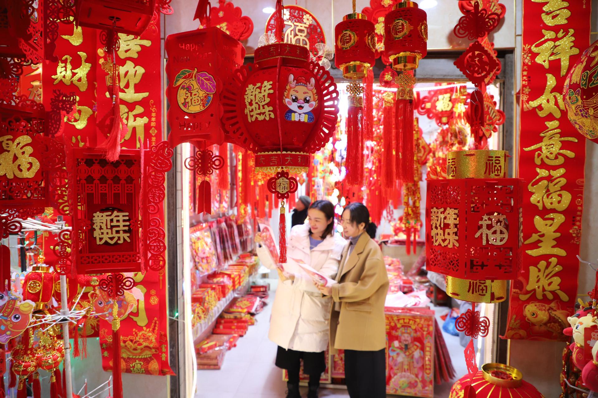 春节临近,水富市大街小巷散发出浓浓的年味,广大群众红红火火迎新春。2月2日,是北方小年,人们购买年货,张灯结彩,喜气洋洋。图为市民在水富市年货店铺挑选新春饰品。