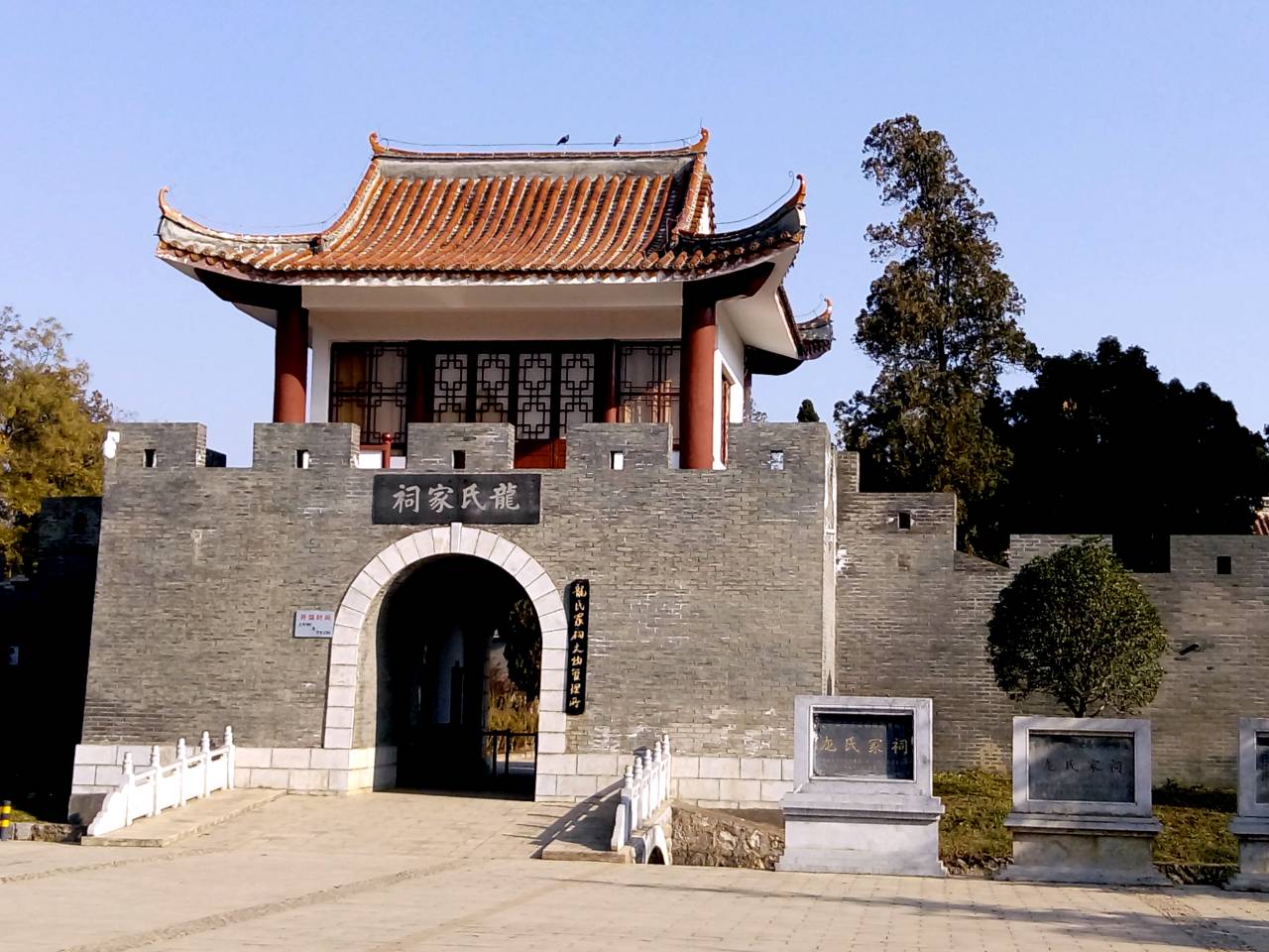 首先来到祠堂西大门,高大的门楼映入眼帘,歇山顶、盖青瓦。大门采用法国科林斯式样建筑风格,外观华丽庄重,门廊高大,须弥座台上设石望柱及门柱支撑门庭,柱子独立对称,门框受力均衡,两侧立柱上各有一个装饰攒尖,砖砌弧形门外部用白膏拉浆粉饰,并做有彩塑花卉叶片。大门分东西门,门头均有石横匾,书有“源远”与“流长”字样,朱红色的大门上装有传统的狮兽头门环。大门里面皆为中国传统的门式样,檐口雕有龙凤,柱头悬空,串架榫卯紧扣,两扇红漆大门上安有中式的门闩,两侧中部还有顶门的石榫。前院高大的三叠水式照壁,讲究的是不露风水,保家族“福禄吉祥”,寓意里面的财气和福气不外泄,隐喻龙氏对外不显山露水,而财源不外流。照壁中央嵌有三块大理石山水石屏,照壁四角翘有兽吻,脊上镂空的石镏宝顶用青花瓷器碎片贴饰,檐上的“天菩萨”豁达且笑容可掬,最具彝族的代表性。