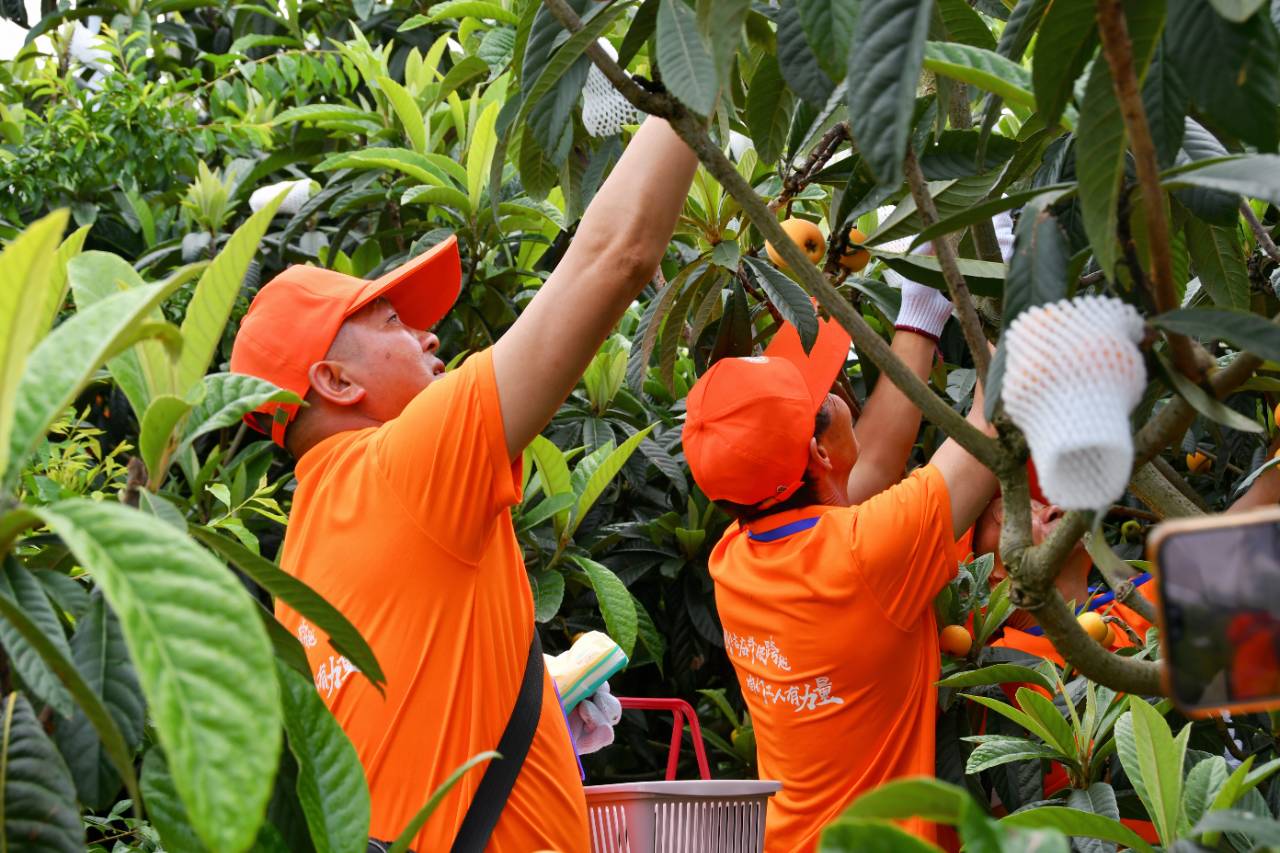 随着裁判一声令下,选手们争先恐后地钻入枇杷林,有的踮起脚尖,有的登上枝头,把手伸向自己看中的果子,摘下后小心翼翼地放进篮子里。