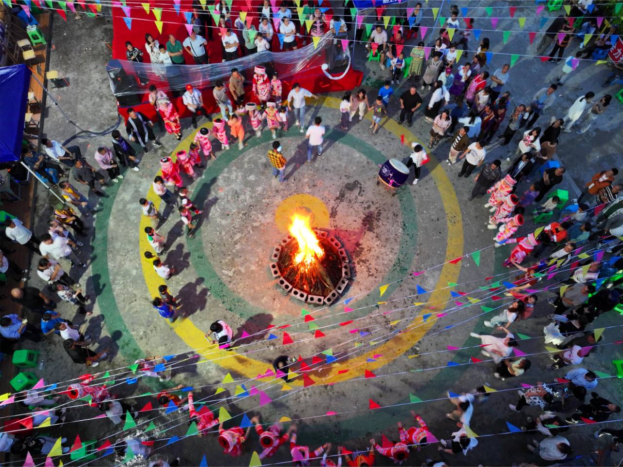 夜幕降临,鼓声响起,熊熊的篝火腾空而起,照亮了夜空,映红了笑脸,苗家儿女和游客们手拉手、肩并肩,载歌载舞,享受丰盛的苗家篝火文化“盛宴”,转出一个“幸福圆”。