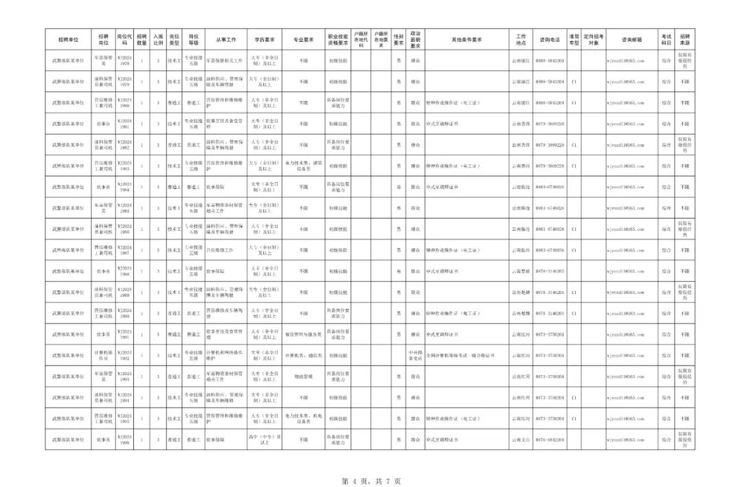 4.有关注意事项。(1)报考人员填报个人信息时应当准确填写个人联系方式,整个报名期间须保持通讯畅通,并及时关注军队人才网发布的取消招聘岗位计划、等比例缩减招聘岗位计划公告,以免错失录用机会。(2)资格条件审查贯穿招聘工作全过程。在招聘各环节发现报考人员不符合报考资格条件的,用人单位均可以取消其报考资格或者录用资格。报考武警部队专业技能类文职人员不收取报名费。