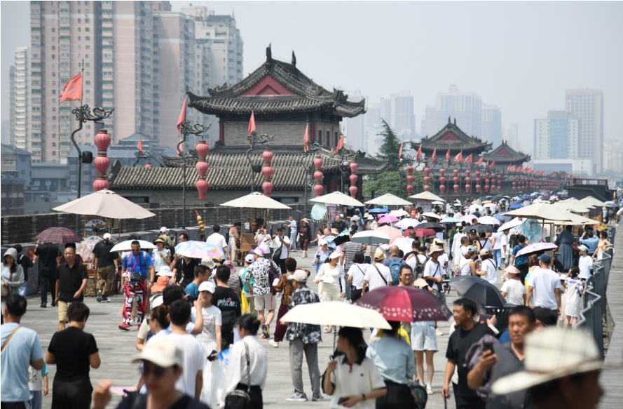 8月8日,游客在西安城墙景区游览。暑假过半,古城西安人气不减,激发文旅消费动能。新华社记者 张博文 摄