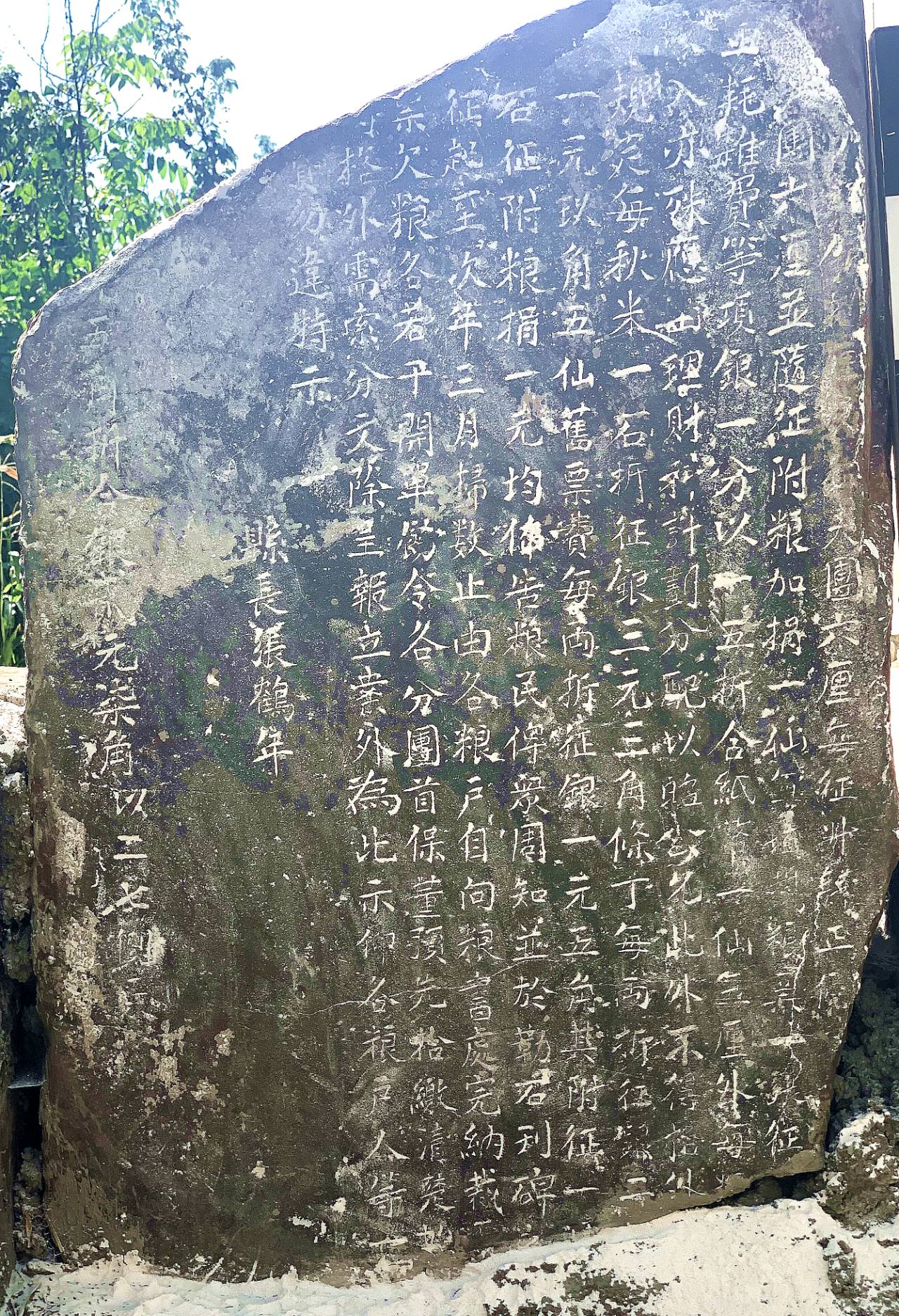安放在龙王井处的两块残碑,其中半块是捐资重修武圣宫的功德碑,碑头上只剩“永垂”两个大字,断掉的不知是“千古”还是“青史”,也有可能是“后世”。碑记内容为遊府、守府、部厅、永善县署两班、各级文武官员和绅耆铺民捐资情况,因残失的一半去向不明,立碑的具体时间无从考证。另一块残碑为民国时期所立,一面是当时的县长张鹤年颁布征粮捐银的折算方式及缴付起止时间的公告,一面是署理(代理)县长张公鹏颁布粮户买田及地拨册手续费的公告,两面均属民国时期的政策公示碑记,从中可以查考民国时期的一些政策信息。