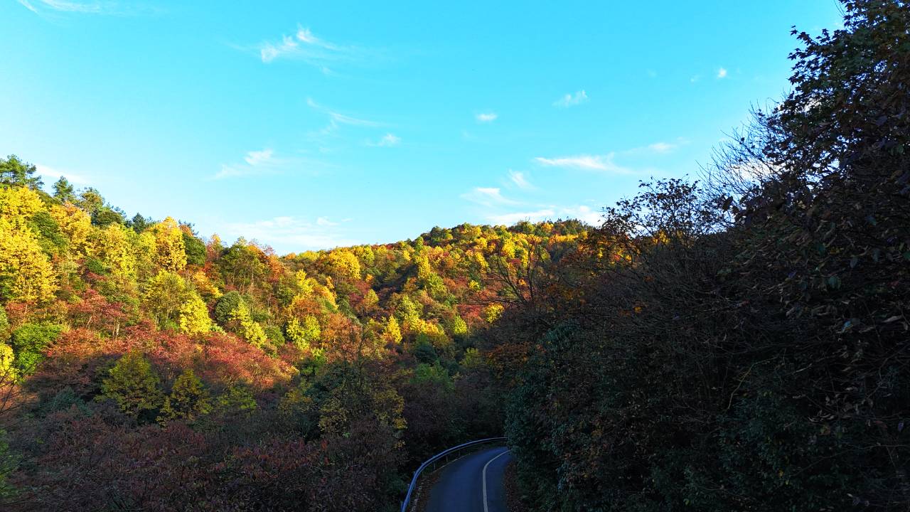 从空中俯瞰,那蜿蜒的公路宛如一条丝带,穿梭在斑斓的山林之间;黄叶点缀的山峰此起彼伏,与湛蓝的天空相互映衬,构成了一幅绝美的画面。