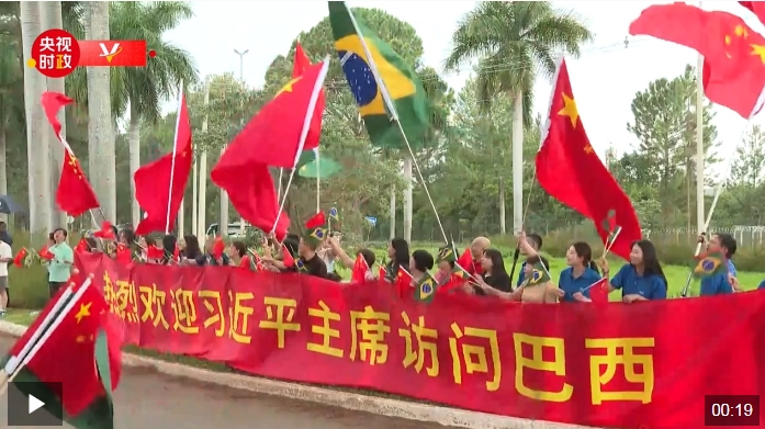习近平乘车从机场赴下榻饭店途中,当地华侨华人、中资机构和留学生代表在道路旁挥舞中巴两国国旗,高举“欢迎习近平主席访问巴西”“中巴友谊万岁!”等红色横幅,热烈欢迎习近平到访。