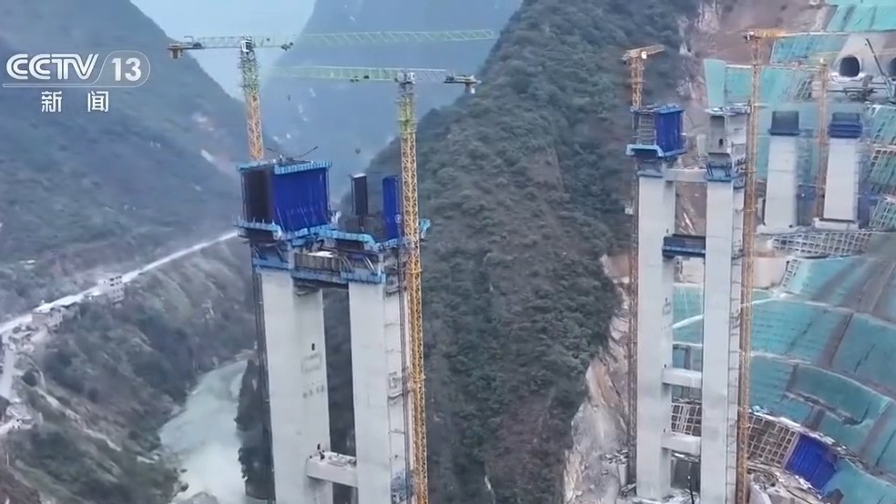 洛泽河特大桥全长524.9米,是目前我国时速350公里高速铁路跨度最大、墩身最高、边坡最高的预应力混凝土桥梁。大桥所处的地理位置非常特殊,跨越深切峡谷,两端与隧道相接,属于山区铁路典型的两隧夹一桥V形地貌。通过航拍画面可以看到,两边的山体非常陡峭,有些地方近乎垂直,对施工带来很大影响。在4年的施工过程中,面对复杂的地质条件和高难度的施工要求,建设者不断优化施工方案,一方面引入智能化监测设备,一方面采取针对性的施工工法,其中先塔后横梁的异步施工等两项工法,已经申报了相关专利。