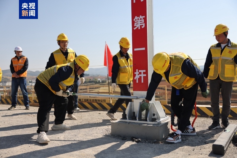 3月25日上午,在云南省昆明市渝昆高铁建设现场,施工人员将首根接触网杆安装到指定位置,标志着渝昆高铁云南段正式进入“四电”工程施工阶段,为全线建成通车奠定了基础。