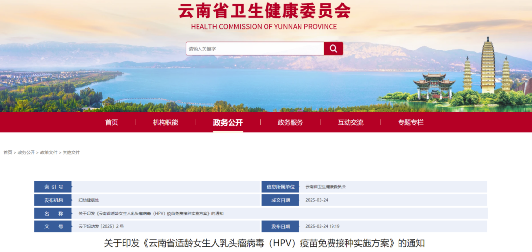 云南省人民政府确定实施生物疫苗惠民工程为2025年10件惠民实事内容,按照知情、自愿原则,为全省符合条件的初一在校女生免费接种国产HPV疫苗。为组织做好疫苗接种相关工作,制定本实施方案。