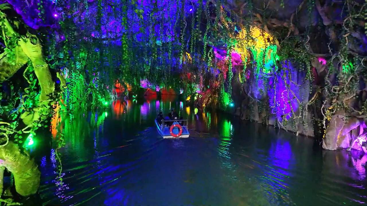 山海洞是一个以《山海经》文化为主题的文旅项目,通过声、光、影技术,把女娲补天、蚩尤战场、百鸟朝凤、禹杀相柳等40多个梦幻场景投影到溶洞穹顶上。身临其境,游客不仅能享受天然溶洞的凉爽,还能领略科技呈现的《山海经》奇幻世界。