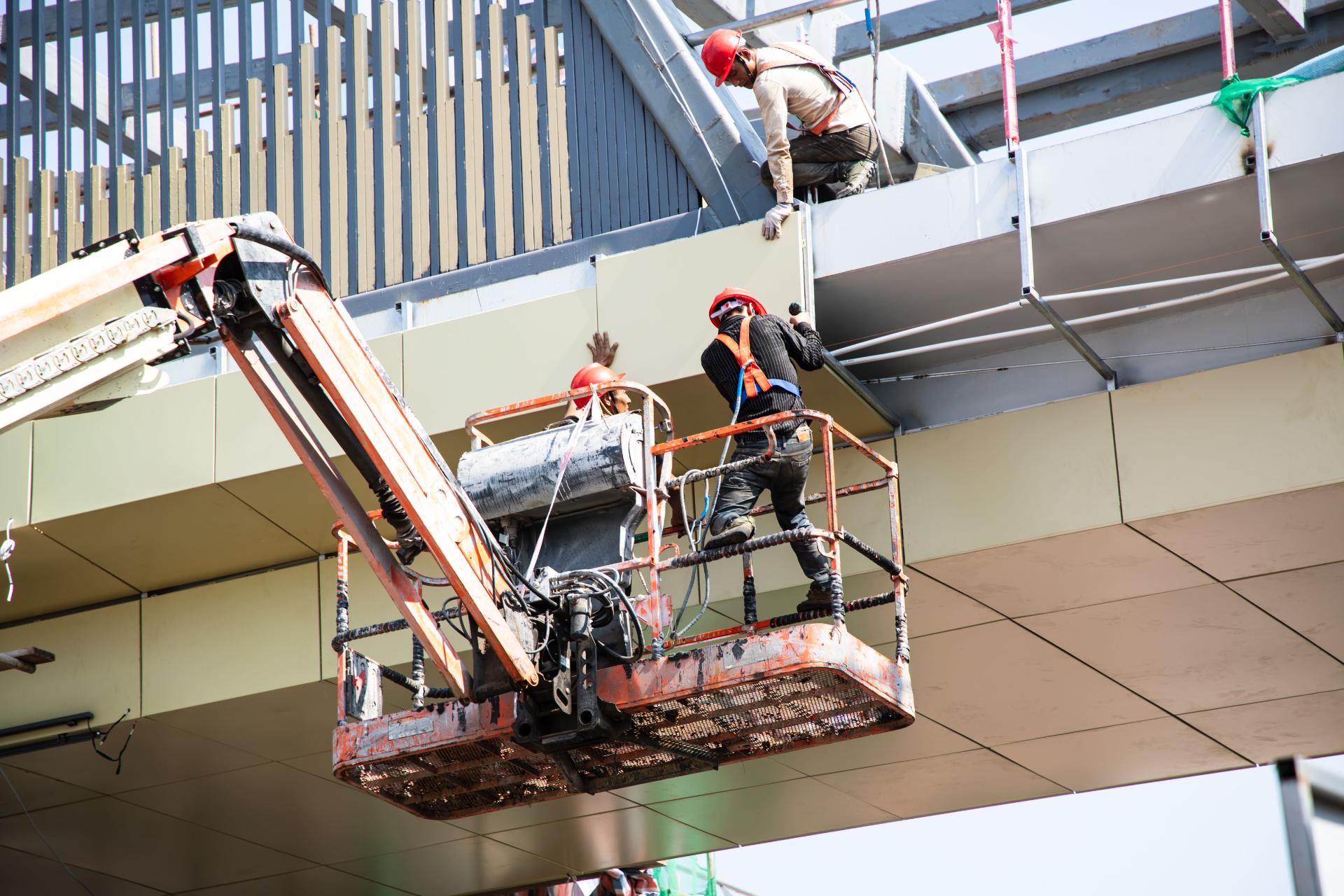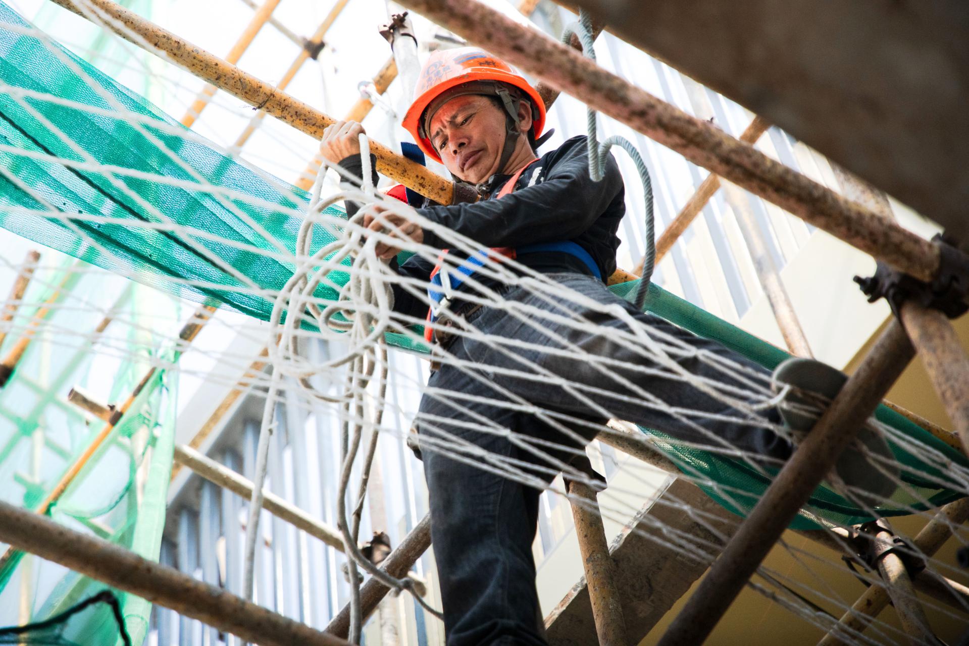 8月3日,永善县某学校旁的在建人行天桥施工现场,工人正错时施工,确保天桥在秋季学期开学前投入使用。