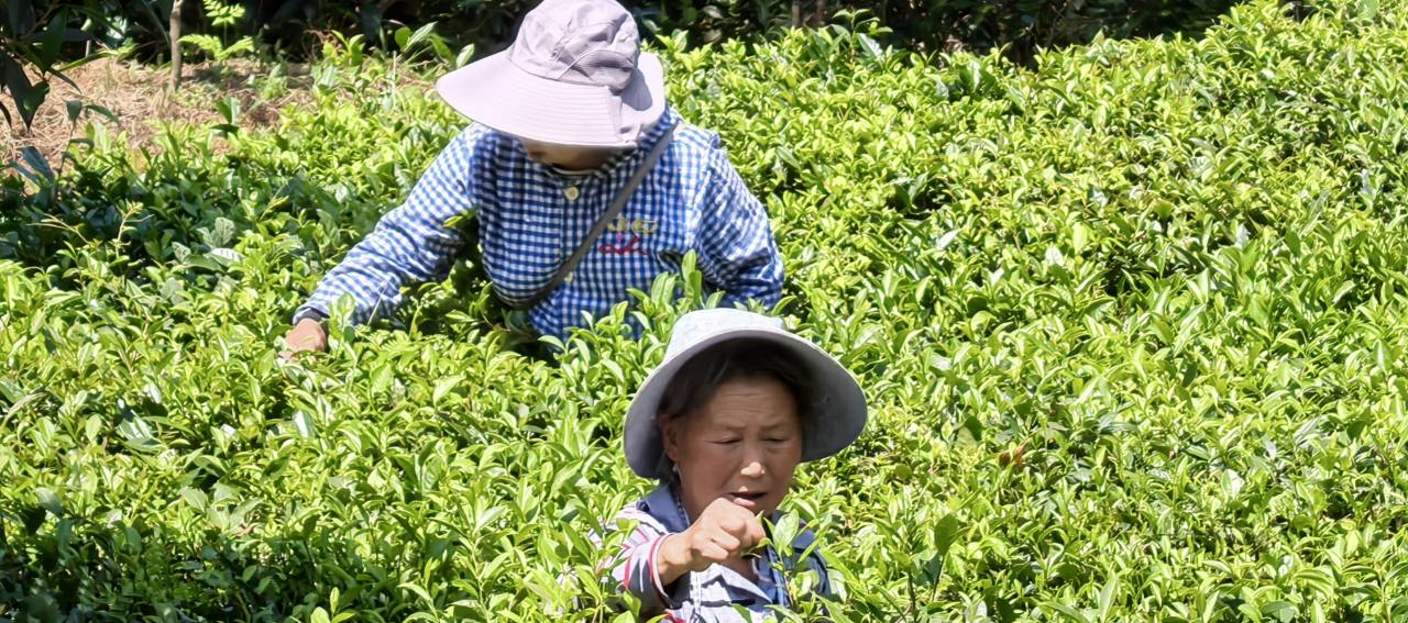 移步茶园入口,一块醒目的标志牌映入眼帘,上面简洁的采茶技巧令人印象深刻:采茶时需用左手扶稳枝条,右手拇指与食指轻捏芽尖,采摘一芽一叶或一芽二叶。这里严格执行“八不采”原则——雨天不采、露水未干不采、紫色芽不采、风伤芽不采、虫伤芽不采、开心芽不采、空心芽不采和有病弯曲芽不采。在鲜叶储运环节,不能使用布袋和塑料袋,也不能堆压或在烈日下暴晒,必须用竹箩、竹篮、竹筐等工具盛装。