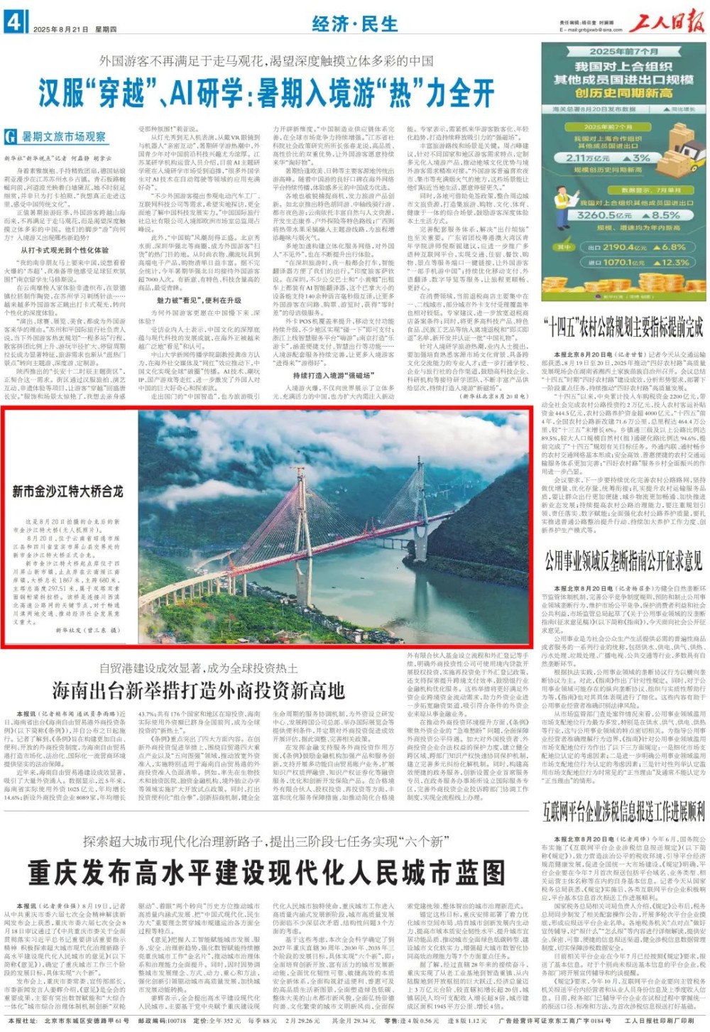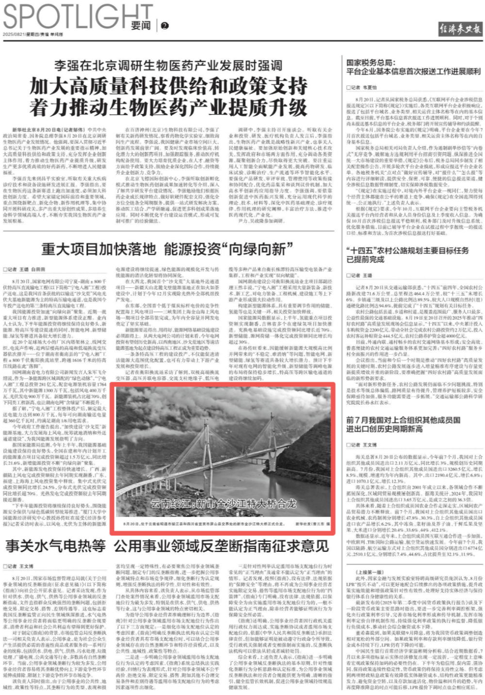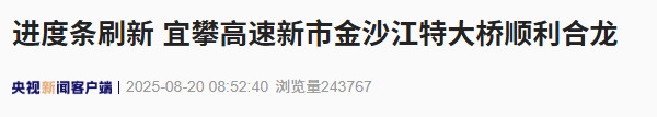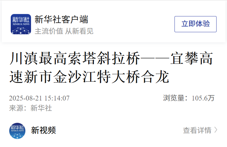 8月20日、21日,《人民日报》头版、新华社“新视频”、中央广播电视总台CCTV2《天下财经》、CCTV13《新闻直播间》、央视新闻客户端、《光明日报》《工人日报》《经济参考报》、中国新闻网、云南日报、云南发布等近百家中央和省级主流媒体推出新闻120余篇,关注宜攀高速位于昭通市绥江县南岸镇的金沙江大桥顺利合龙。