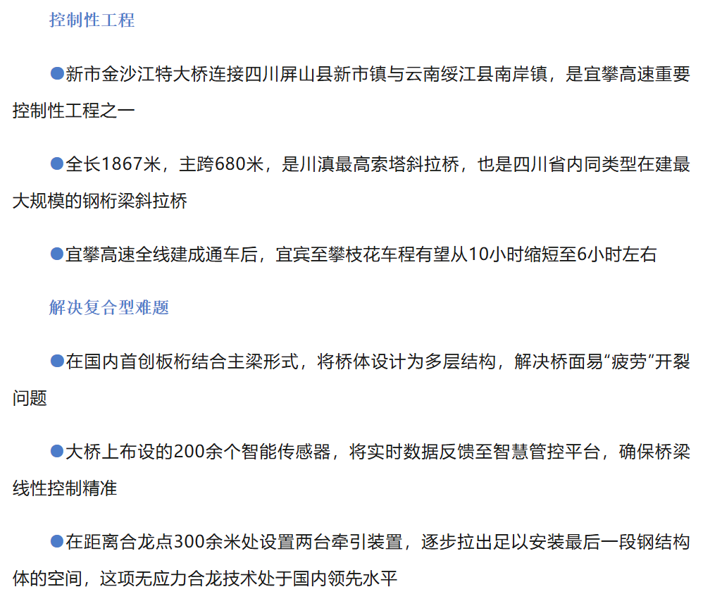 新市金沙江特大桥起于屏山县新市镇,止于绥江县南岸镇,是连接四川与云南两省的重要枢纽,也是第一座连接屏山县、绥江县的高速公路大桥。建成后,能有效提高成都至昆明交通运输大通道的运输能力,与金沙江航道、G85渝昆高速形成综合立体交通运输体系。宜宾至攀枝花高速公路,是《四川省高速公路路网规划》中成都至丽江高速公路的重要组成部分。宜攀高速按四车道高速公路标准建设,由宜金段、金宁段、攀宁段三个部分组成,主线全长429公里,预计2025年全线建成通车。