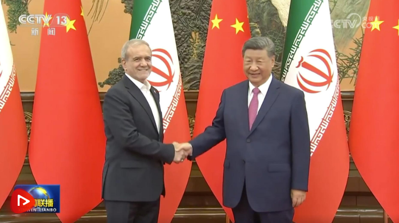 习近平指出,中伊关系经受住国际风云变幻考验,保持平稳健康发展。去年我们在喀山会晤后,两国各部门积极落实双方达成的重要共识,中伊各领域合作取得不少新成果。中方始终把发展对伊关系置于中国中东外交重要位置,愿同伊方赓续友好,深化互信,加强在贸易、投资、清洁能源、互联互通等领域合作,增进人文交往,携手推动中伊全面战略伙伴关系行稳致远。中方提出全球治理倡议,愿同包括伊朗在内的国际社会一道,推动构建更加公正合理的全球治理体系,携手构建人类命运共同体。