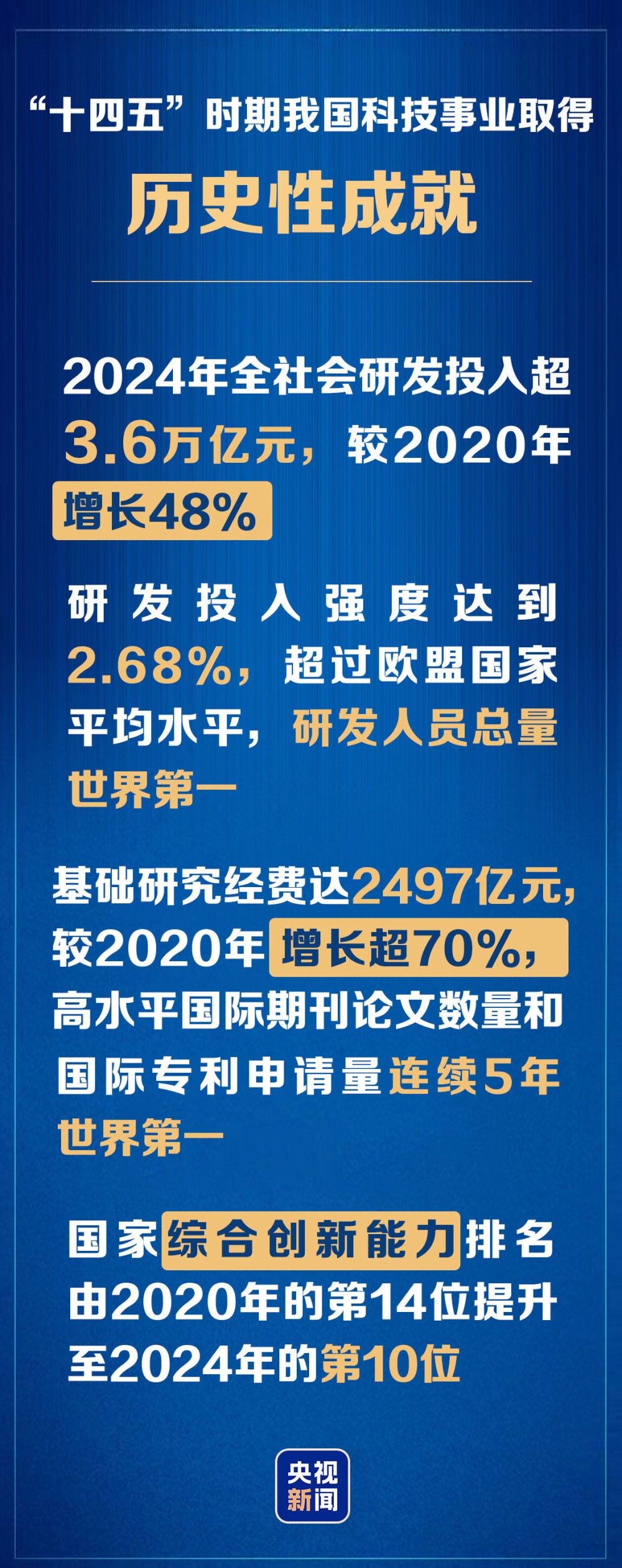2024年全社会研发投入超3.6万亿元,较2020年增长48%;研发投入强度达到2.68%,超过欧盟国家平均水平;研发人员总量世界第一。