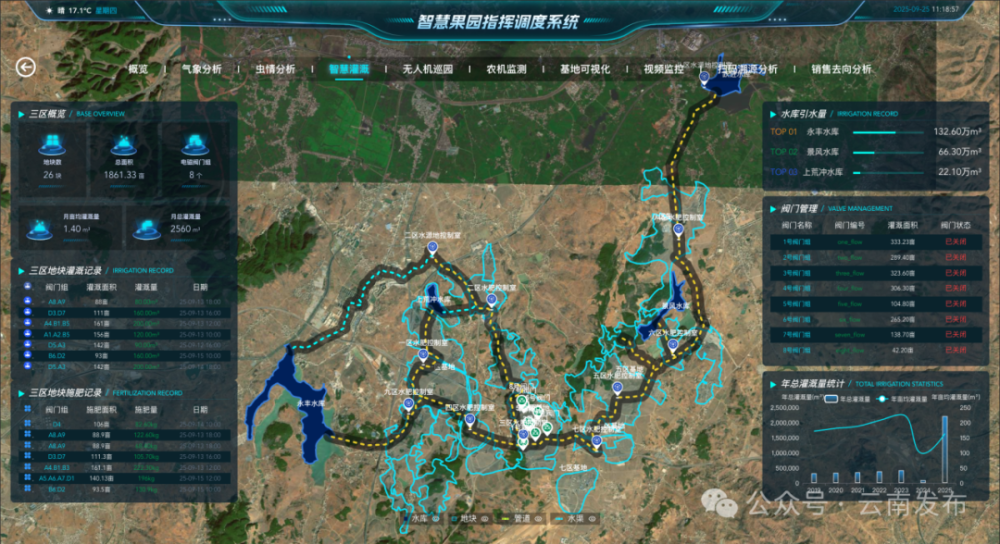 在智慧果园里,数智化系统如同“健康管家”,24小时不间断采集空气温度、湿度、光照强度、土壤水分、养分含量等关键数据,为树势分析、产量预测、果品成熟度判断提供支撑。“当平台监测到土壤水分低于阈值时,会自动触发灌溉系统,为果树精准补水;若土壤养分不足,也会及时提醒工作人员按需施肥。”技术团队负责人张刚说,“健康管家”让果树始终处于最佳生长状态。