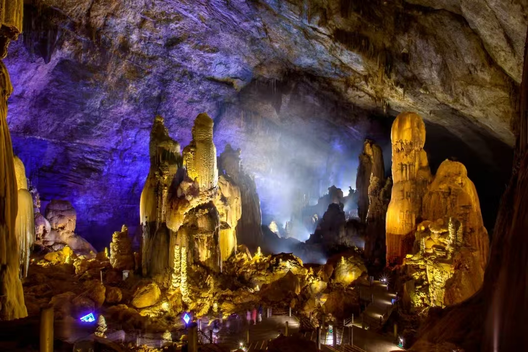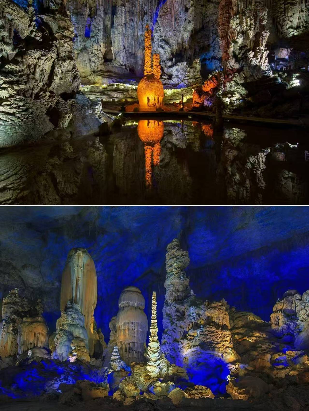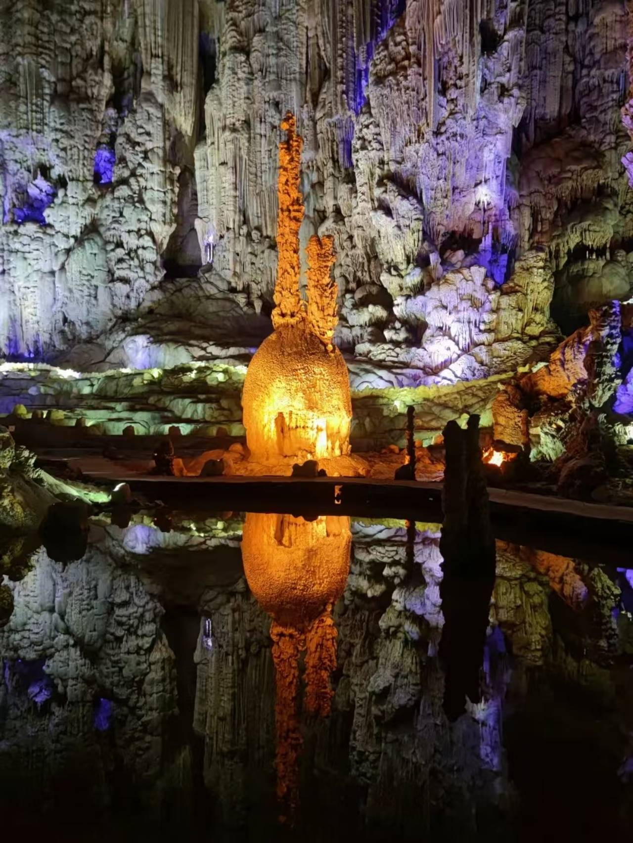 “霸王盔”尽显雄浑气势,14米高的石笋形似古代楚霸王的头盔,底部直径约12米,表面纹理如铠甲鳞片,仿佛历经千军万马的洗礼;“姊妹玉树”亭亭玉立,两根洁白的钟乳石相依相偎,灯光下泛着柔和光晕,似两位身着素衣的少女低语呢喃。此外,“卷曲石”“普贤骑象”等景观各具特色,有的如流云舒卷,有的如神兽伫立,每一处都在诉说着地球亿万年的沧桑变迁。