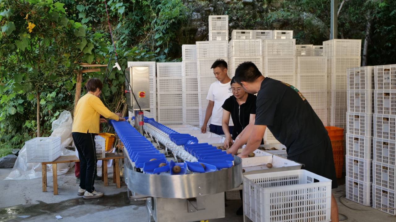 永善县细沙乡辉腾农业有限公司的猕猴桃种植基地里,成排的果树绿荫如盖,藤蔓间,圆润饱满的猕猴桃密密匝匝,挂满了枝架,果实上青褐色的果皮裹着细密绒毛,透着新鲜与活力。工人们穿梭在果树间,指尖轻托果实、小心摘下,动作娴熟而轻柔。分拣区内,一条自动化流水线平稳运转,工人们迅速将刚采摘的猕猴桃放置于输送带上,分选机根据果实的大小与重量,精准将其拨入相应轨道。另一侧,封装工人手法娴熟,折盒、封胶一气呵成,整个流程高效而有序。