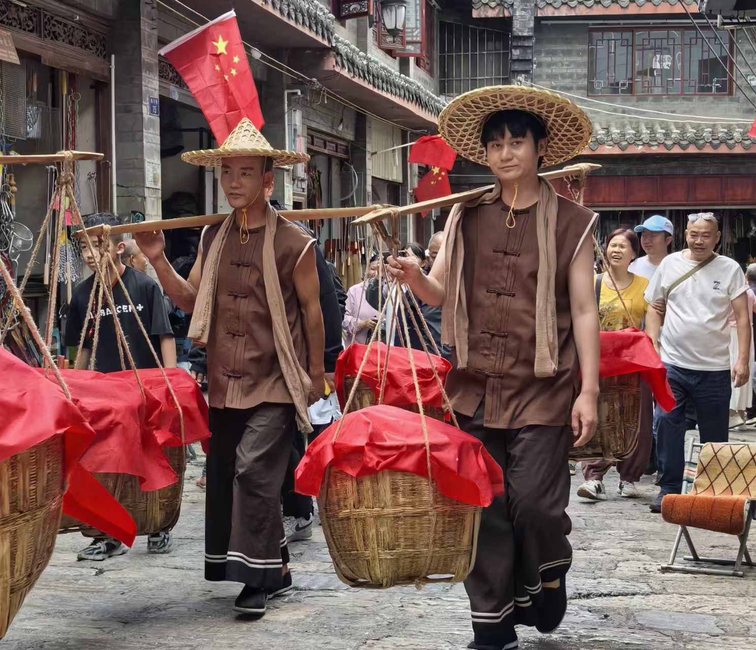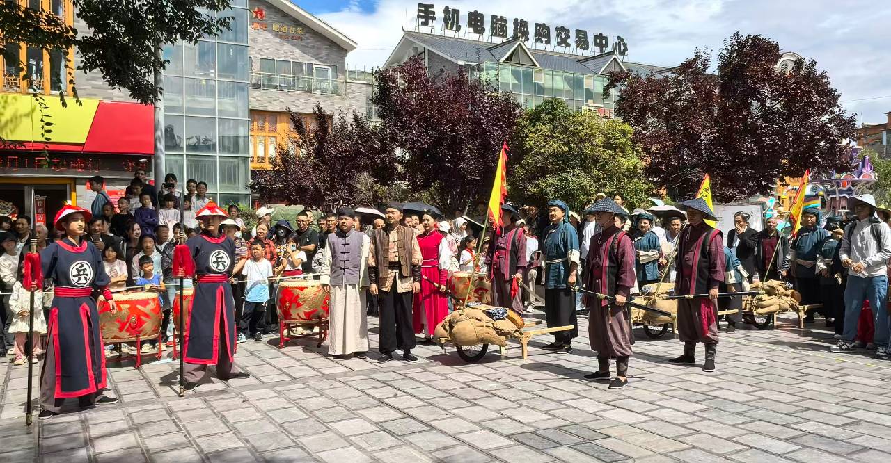 行进途中,巡游队伍串联起多个文化地标,让观众在观演中读懂昭通历史。行至箭道广场时,“武备演练”场景突然上演,几名“士兵”手持长矛列阵操练,呐喊声铿锵有力,再现了昭通作为“滇东北门户”的军事重镇风貌;路过挑水巷,身着粗布衣衫的“市井小贩”推着小车叫卖,“卖糖人咯”“刚出炉的包子”的吆喝声此起彼伏,生动还原了清末民初古城的市井生活;走到大局街商帮旧址前,“王瑞丰”与“李振邦”在此展开“商贸谈判”,两人一来一往的对话中,既展现了商帮之间的竞争与合作,也道出了当年昭通“商贾云集、货通四方”的商贸繁荣景象。